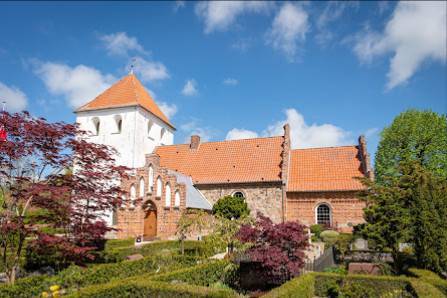 Smuk gammel kirke, der ligger idyllisk ved gadekæret.
